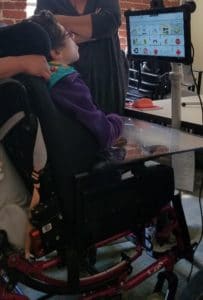 Mobility for Vanessa means confinement to a wheelchair, apart from laying in a recliner or bed. She can move her head and hands, and with intense effort, parts of her lower body and torso. She depends on others to complete all daily needs and to understand her language. Her limited ability to communicate with the world outside of her chair causes Vanessa extreme frustration which can manifest into aggressive and harmful behaviors. Her means of communication at the time consisted of a slight nod or swift side movement of her head (for “yes” and “no”), facial expressions, laughing, vocalizations, body language, and formulation of some single words that at that time were translated by staff to the best of their ability. She has a whiteboard in her bedroom that informs her of what staff are working, any upcoming events or changes to her routine to reduce her anxiety. Vanessa loves books and uses her eyes to identify choices when presented with pictures, but this is a time-consuming process with limited options.